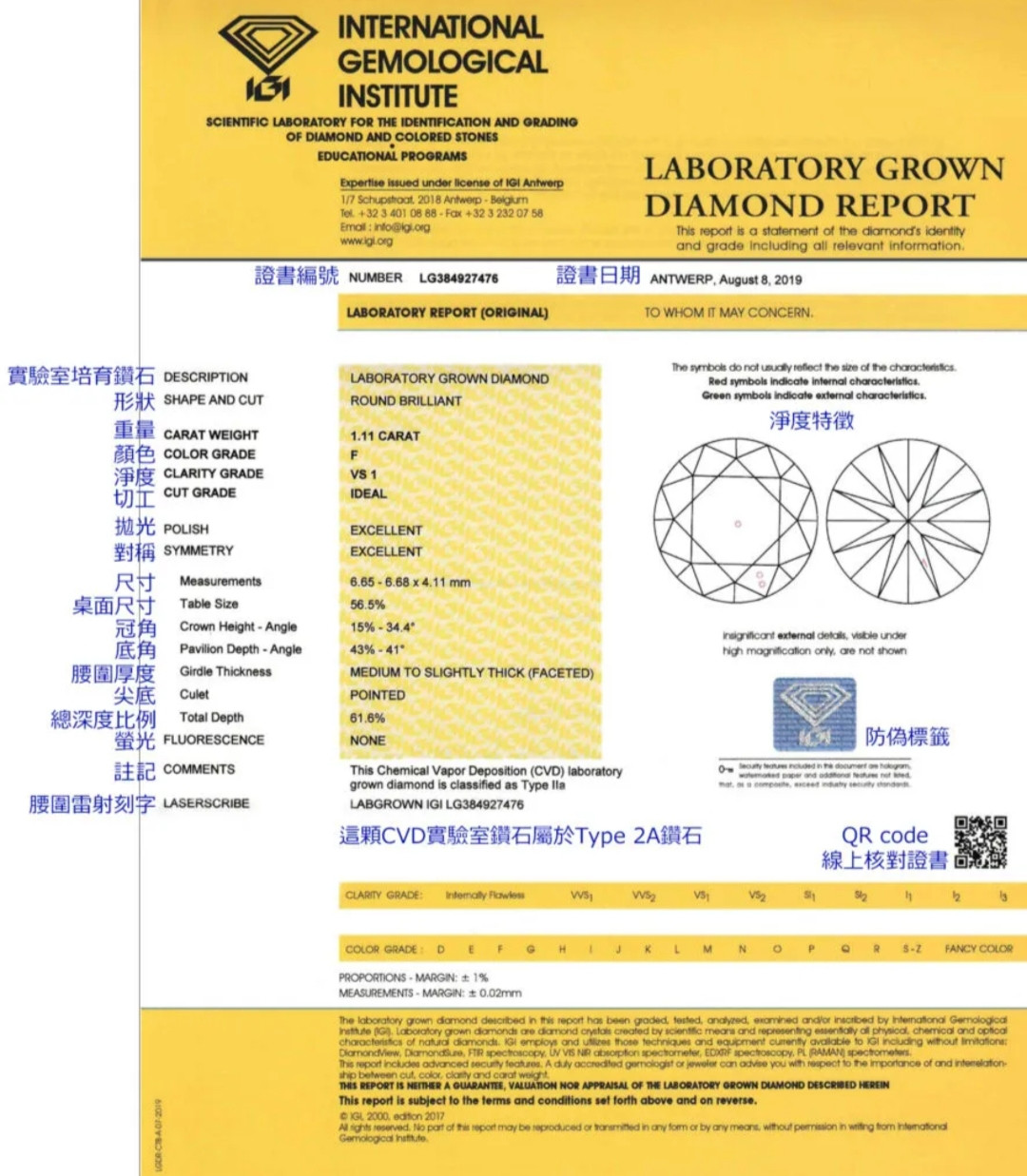IGI 鑑定證書是培育鑽石在全球市場中的重要品質保證文件。它詳細記錄鑽石的4C標準(克拉、顏色、淨度、切工),並清楚標註該鑽石為實驗室培育而成,還會註明其生產技術如CVD(化學氣相沉積法)或 HPHT(高壓高溫法)。