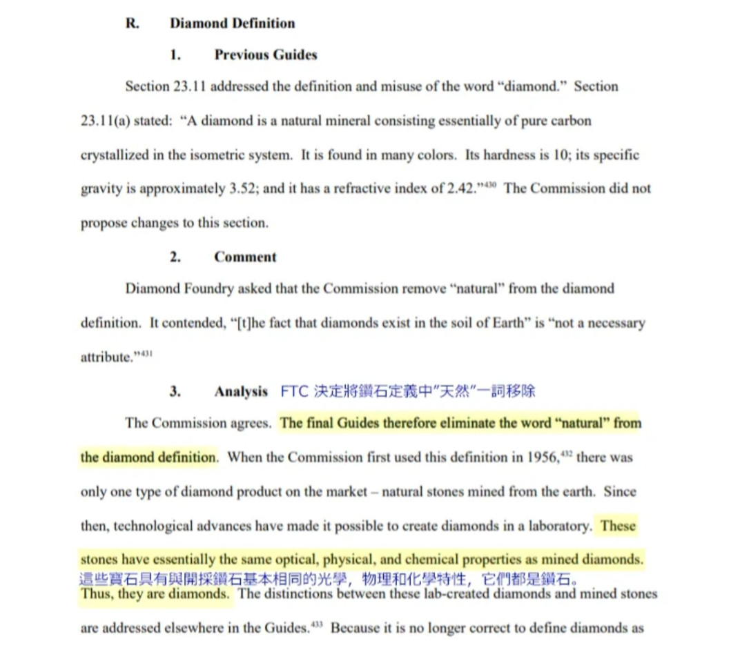 美國聯邦貿易委員會(FTC)於2018年重新定義“鑽石”,將培育鑽石正式納入“鑽石”的範疇,並指出培育鑽石與天然鑽石在化學結構、物理特性及光學性能上完全相同。